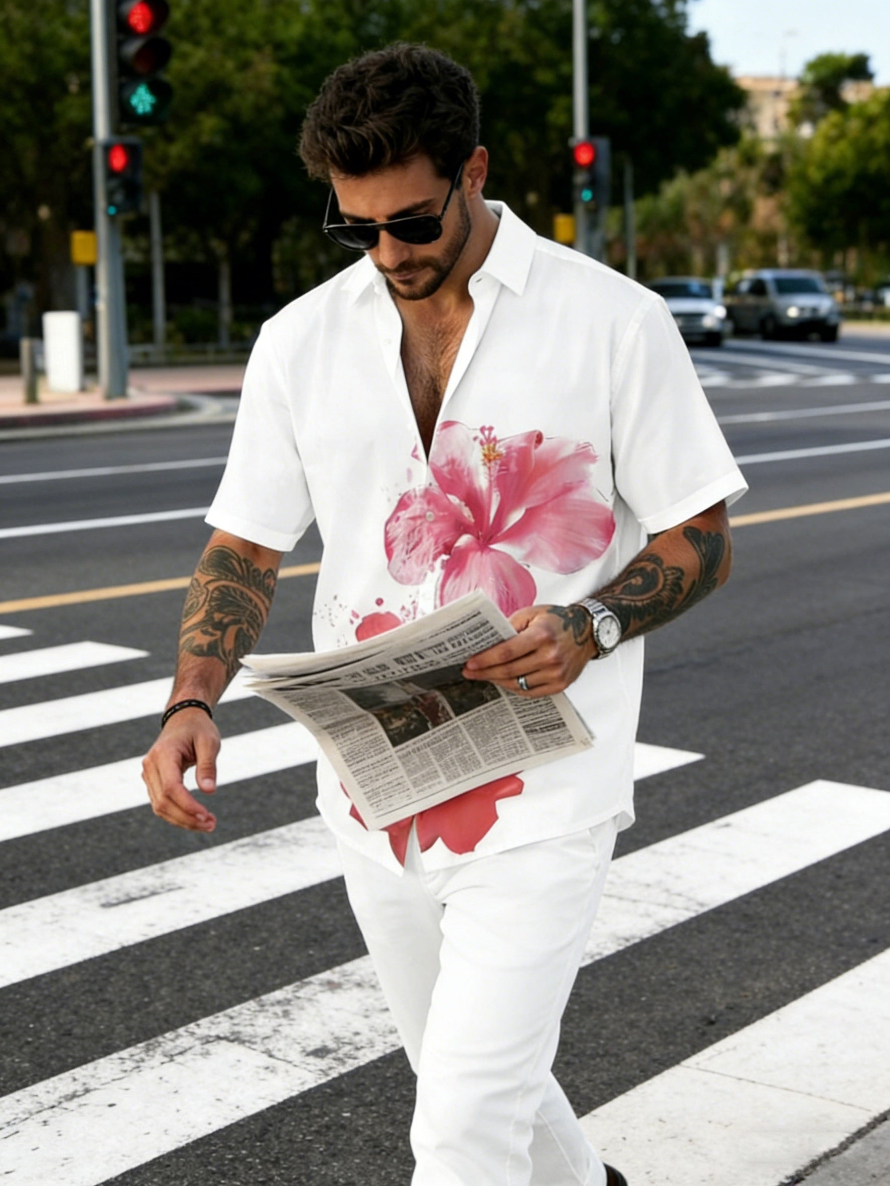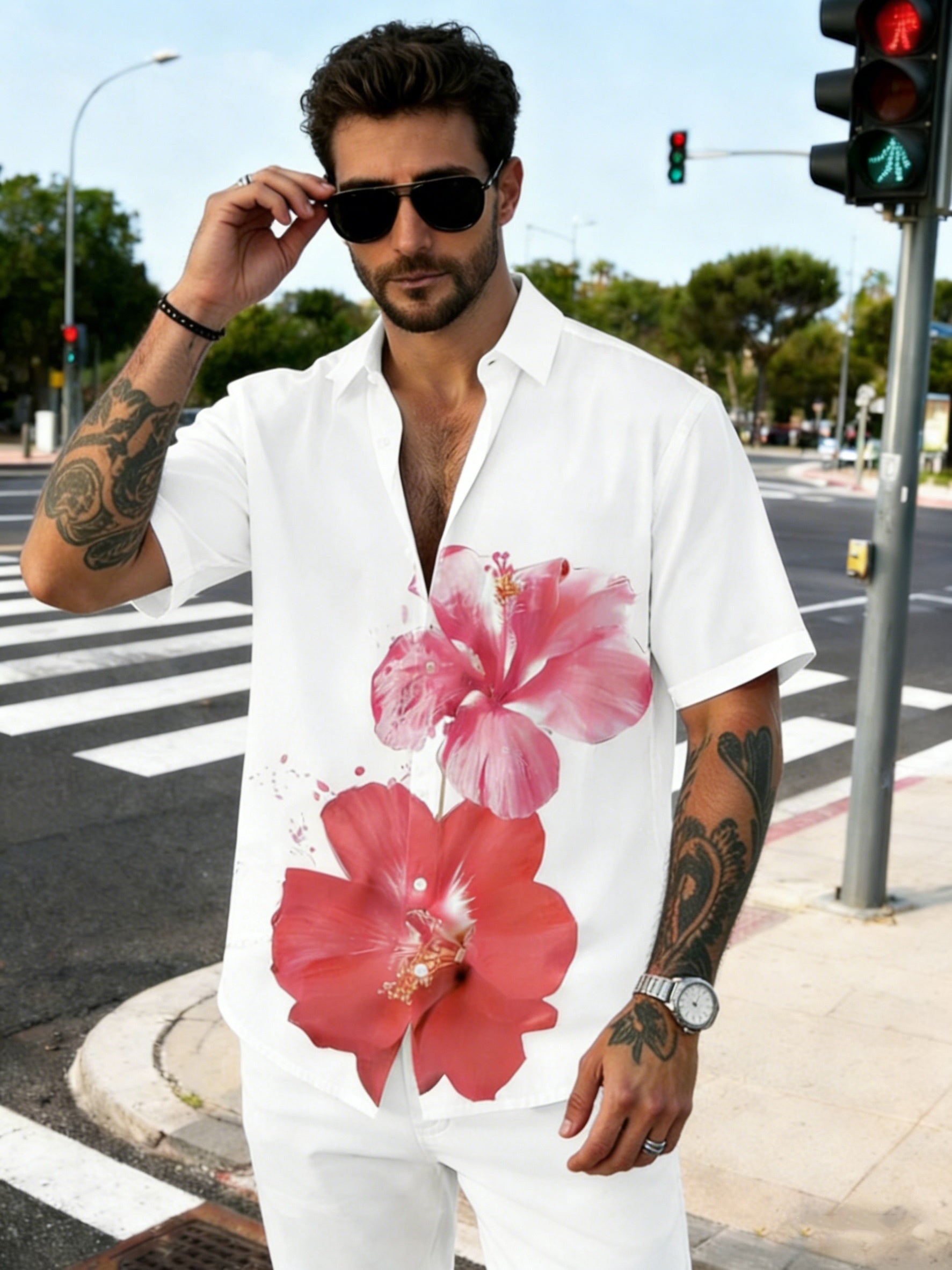 Chemise blanche à manches courtes pour homme, imprimée de fleurs d'hibiscus