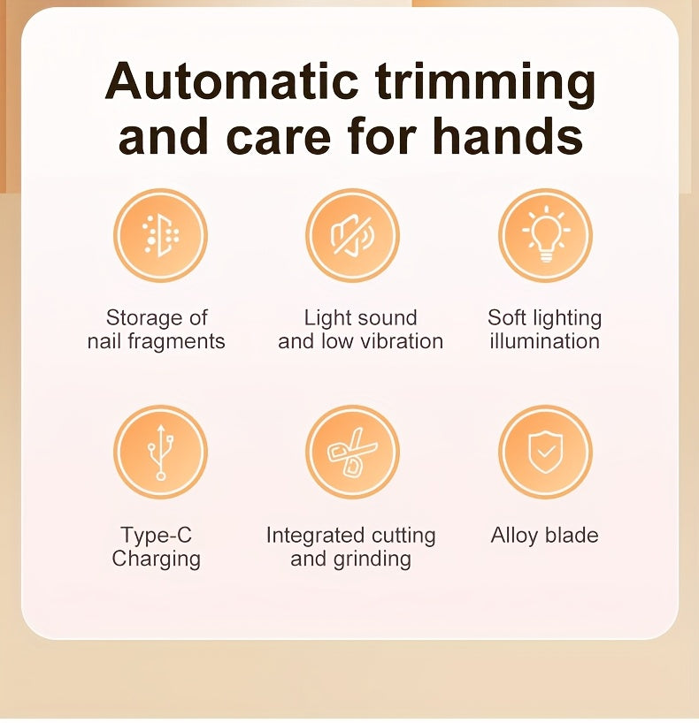 Coupe-ongles électrique intelligent 2 en 1, outil de manucure et de polissage, rechargeable par USB, batterie Li-Polymère 500 mAh, avec fonctions anti-coupure, de ponçage et d'éclairage. Idéal pour la manucure, le limage, le polissage et la mise en forme des ongles.