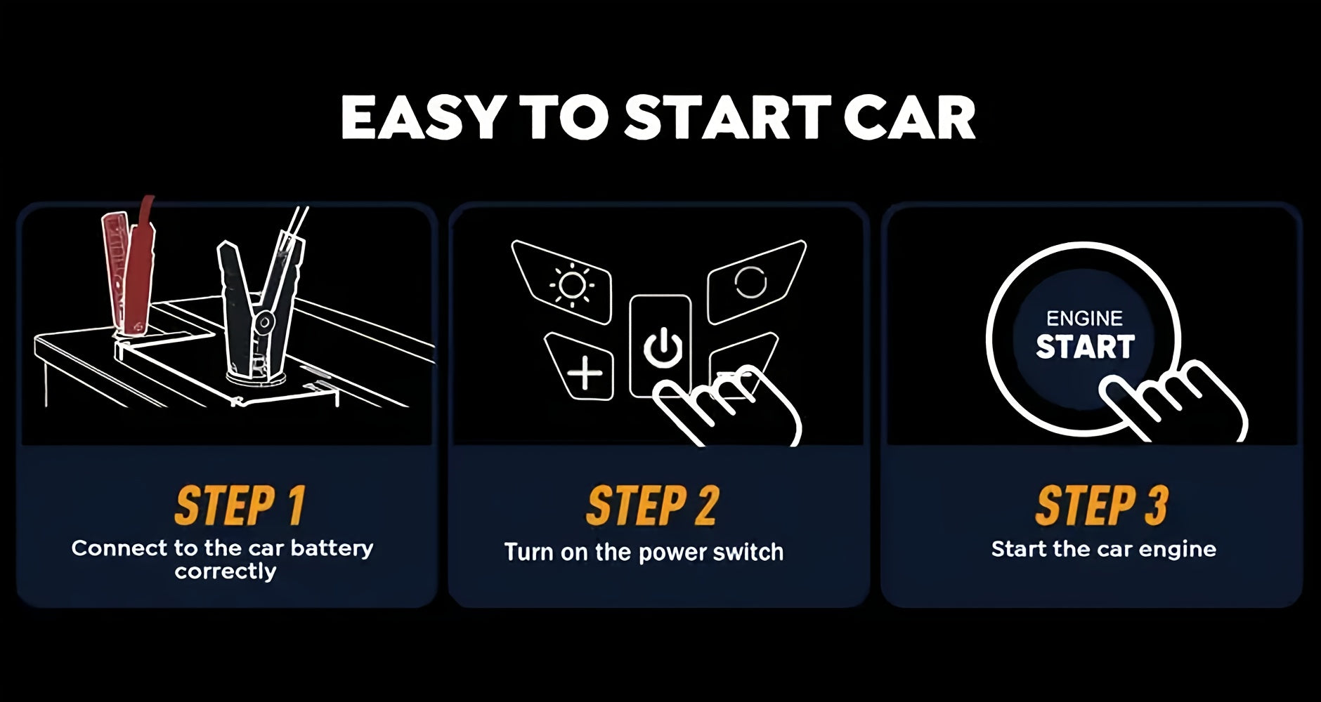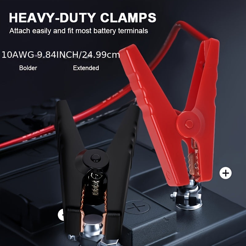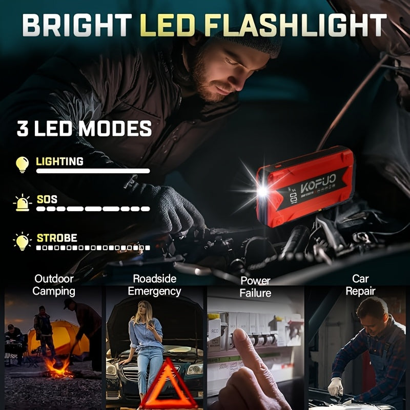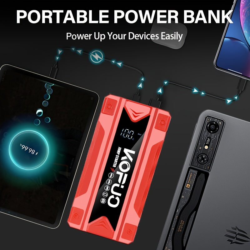 Démarreur de batterie portable pour voiture, d'une capacité de 4 000 A, compatible avec les moteurs essence jusqu'à 8,5 L et diesel jusqu'à 7,0 L. Ce démarreur 12 V est équipé de ports USB, d'une batterie externe, d'une double sortie, d'une lampe LED et d'un chargeur allume-cigare.