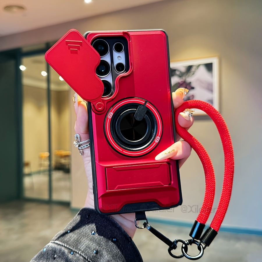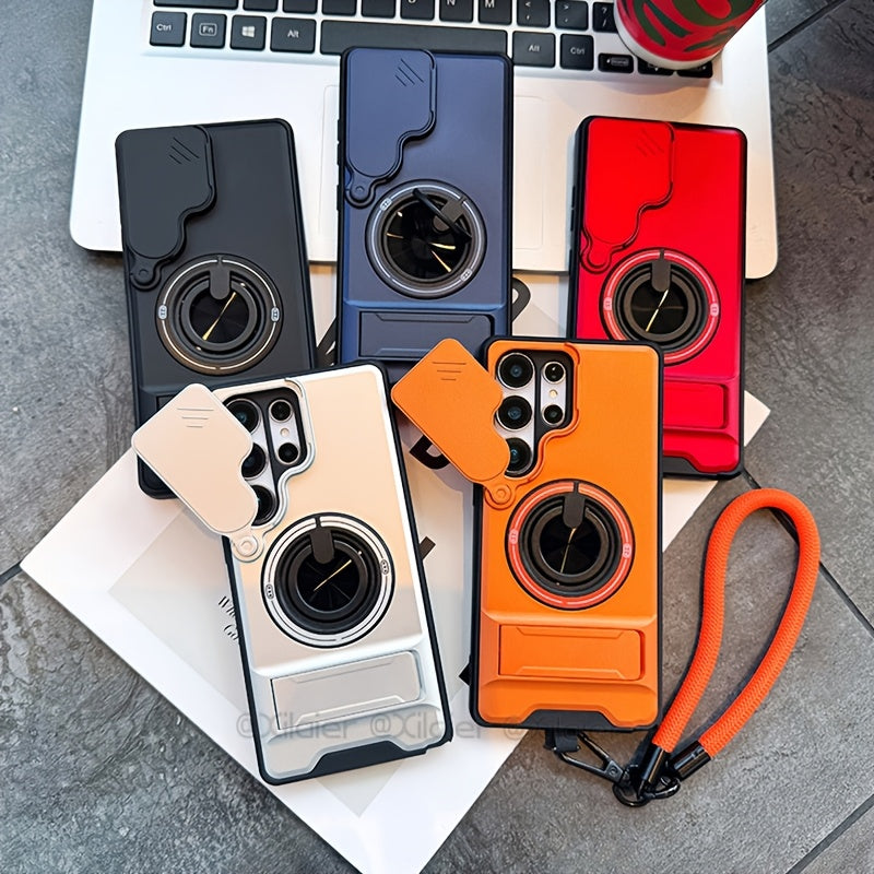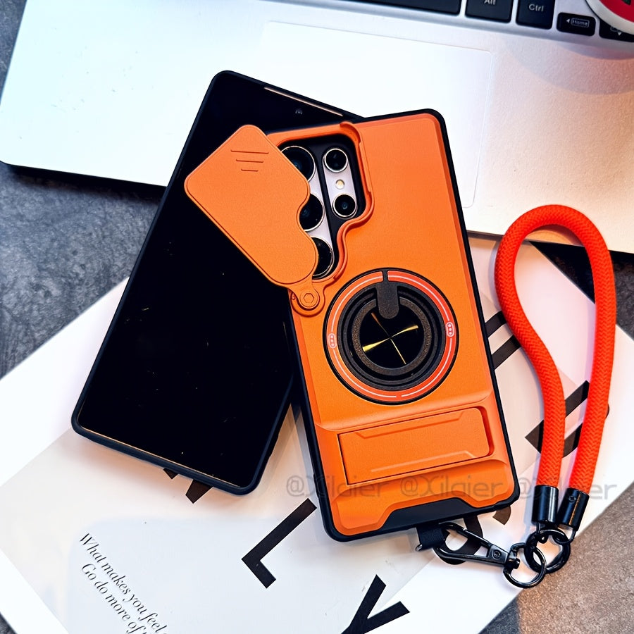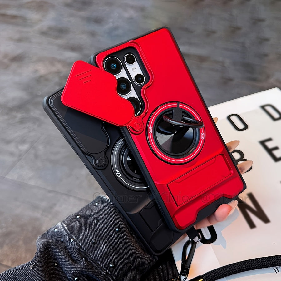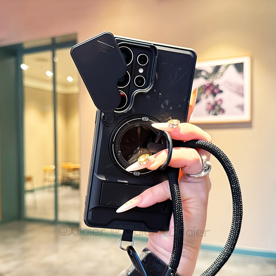 Étui de téléphone : pour Samsung Galaxy S26 Ultra, S25 Edge FE, S24 et S23 Ultra. Étui multifonctionnel avec dragonne, anneau rotatif à 360°, support pliable type barre et protection d'objectif coulissante. Compatible avec les supports de voiture.