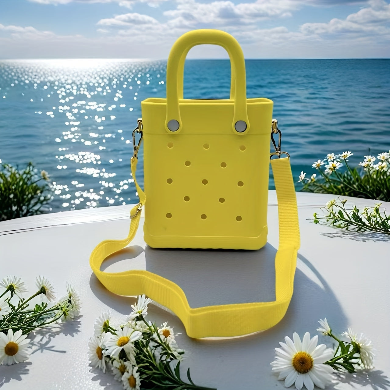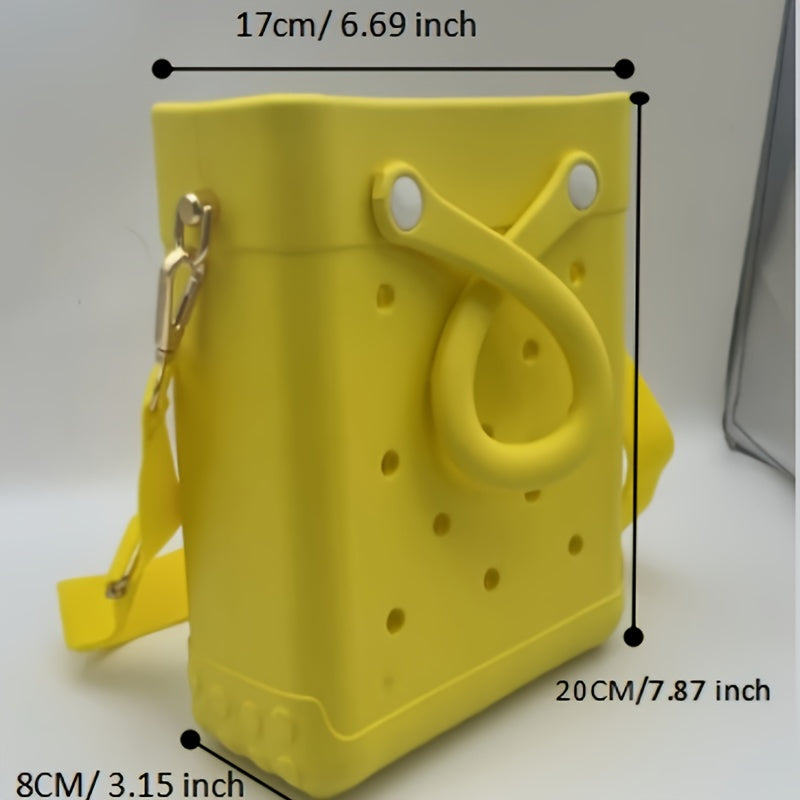 Mini sac de plage en EVA pour femme - Bandoulière ajustable, design perforé, ouverture sur le dessus, léger et résistant, disponible en plusieurs couleurs (rose, blanc, noir, bleu clair, beige, orange-rouge, violet, turquoise, rose).
