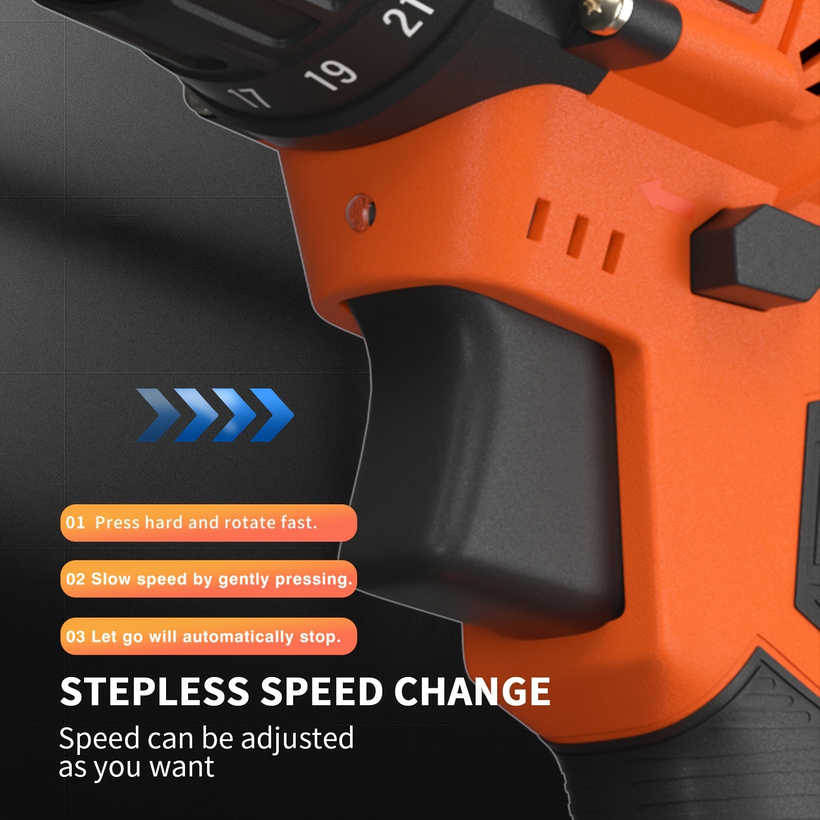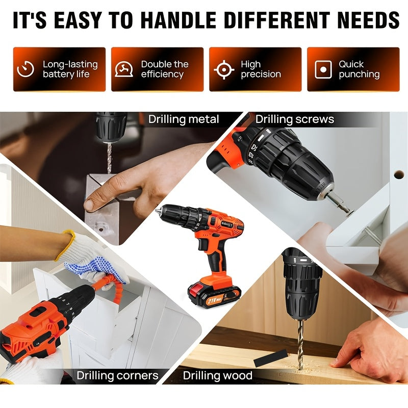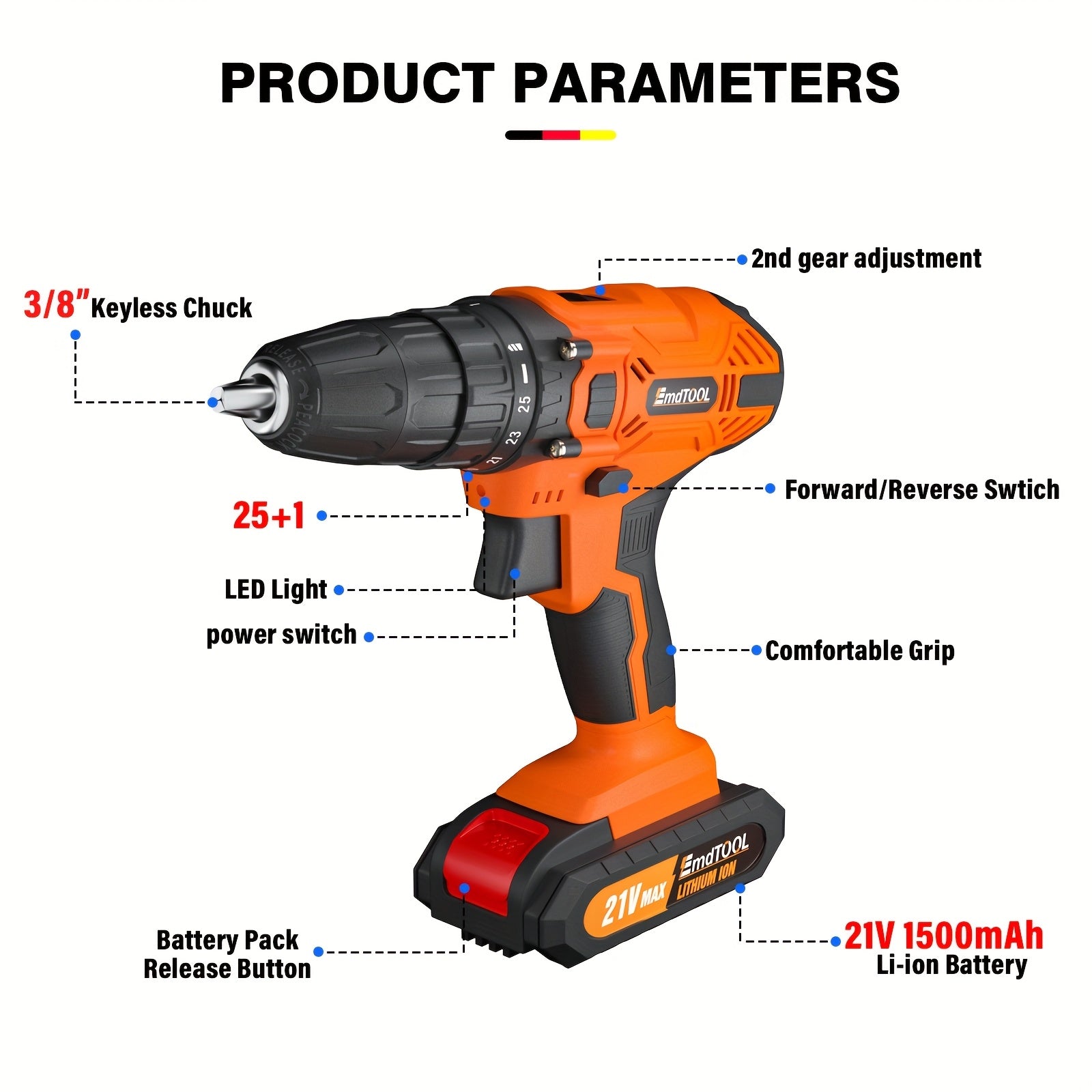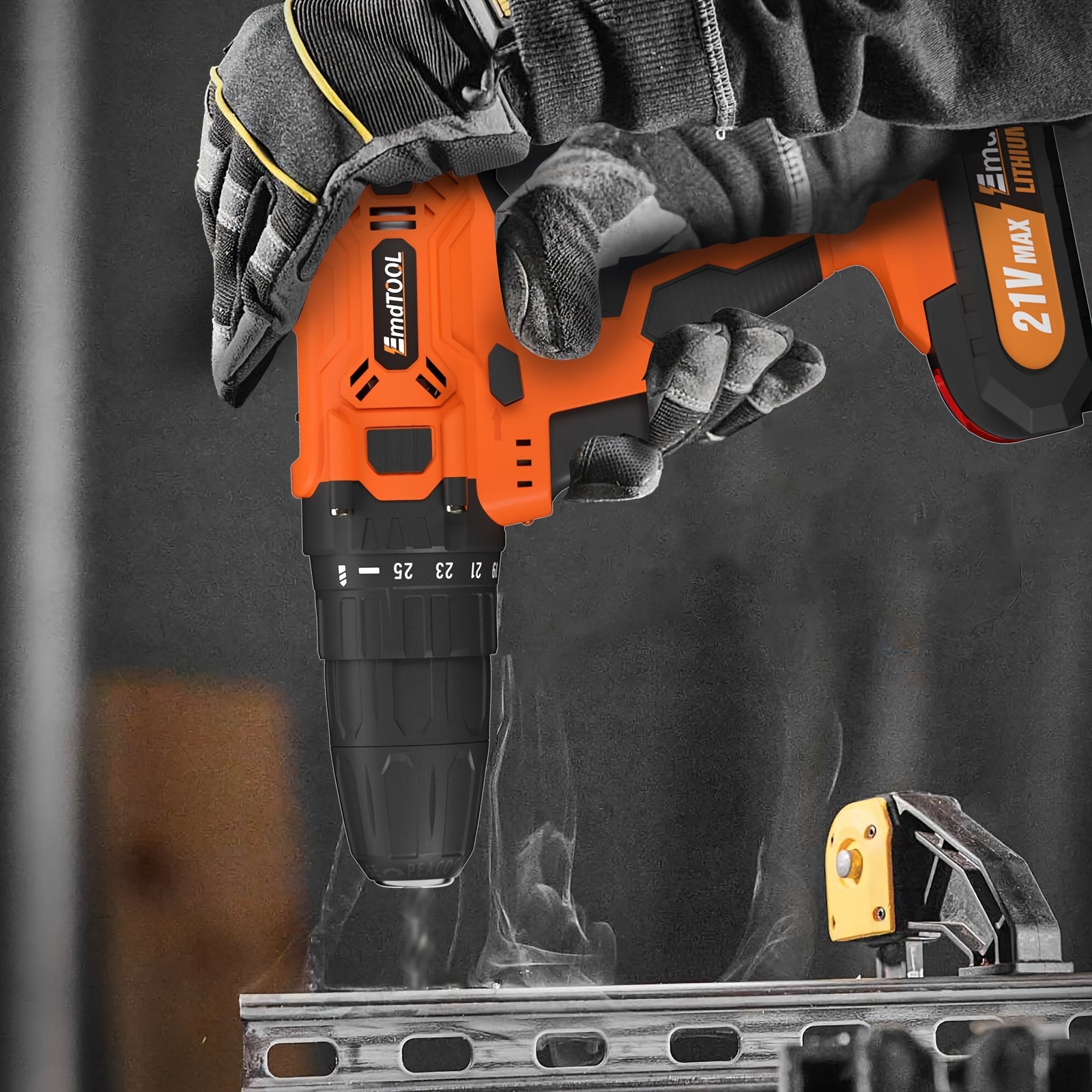 Perceuse-visseuse sans fil 21 V et perceuse combinée - Perceuse électrique robuste avec couple maximal de 45 N.m, embrayage 25+1 positions, 2 vitesses (0-400/1400 tr/min), batterie lithium-ion légère. Idéale pour la maison, le bois, le métal et les plaques de plâtre. Prise européenne.