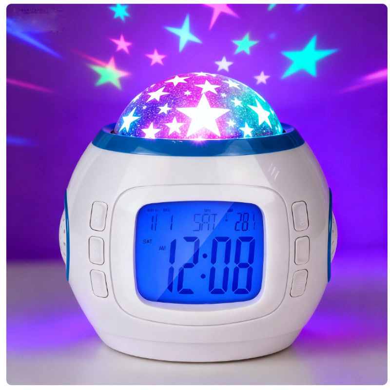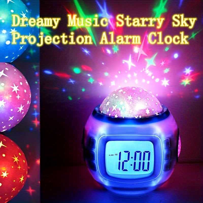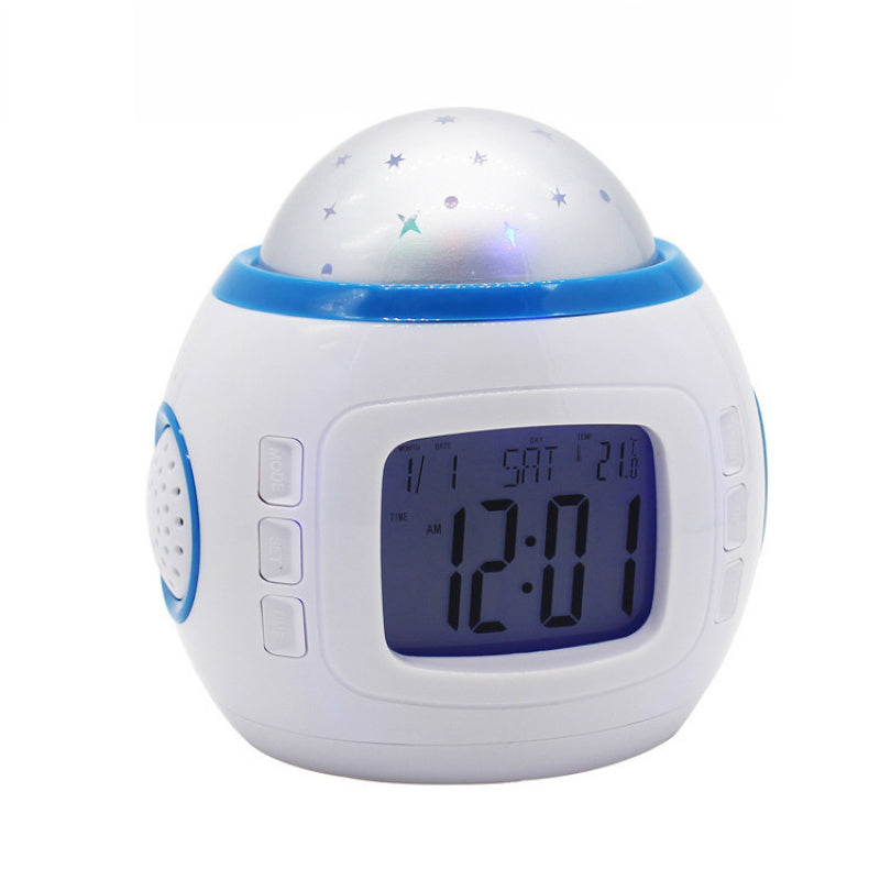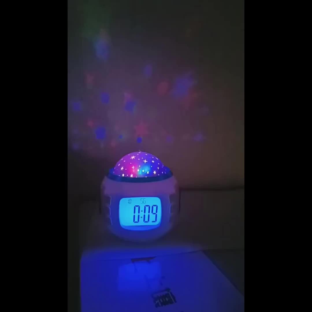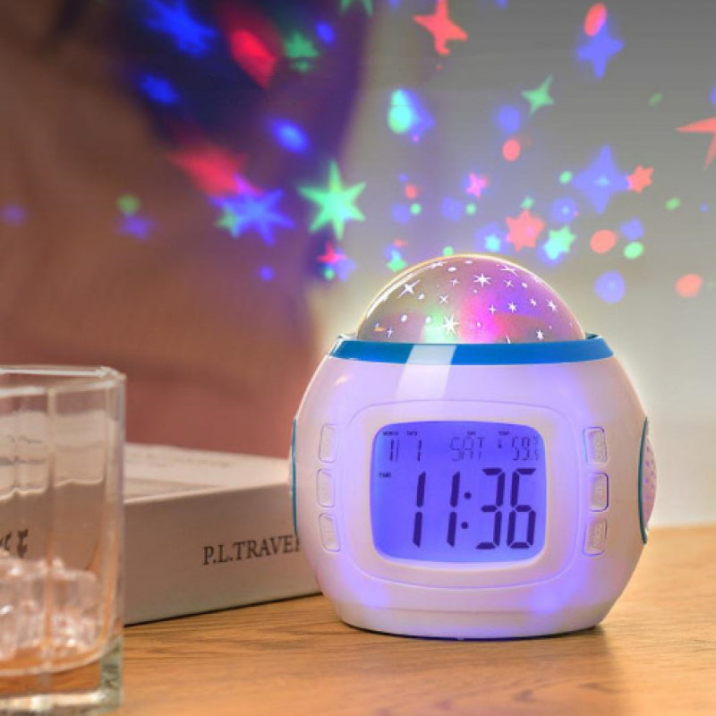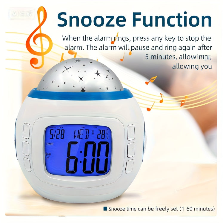 Réveil projecteur de ciel étoilé transformant votre espace en dôme céleste captivant. Cette horloge à projection crée une ambiance élégante et apaisante, idéale pour les chambres, salons et bureaux. Dotée d'une fonction musicale intégrée et d'un boîtier en plastique durable, elle fonctionne avec des piles AAA (non incluses). Un accessoire de décoration sophistiqué qui allie utilité et atmosphère raffinée pour vos intérieurs.
