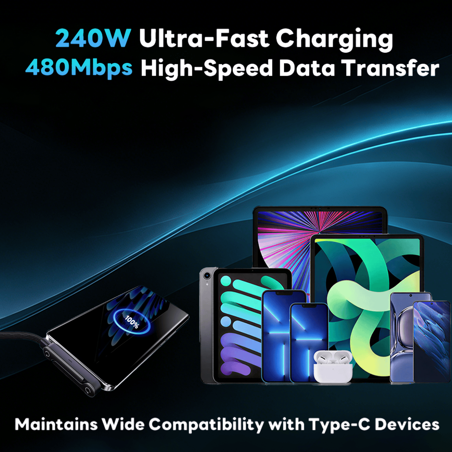 Support de téléphone pliable à charge rapide 240 W (1 pièce) | Câble de données pliable 2 en 1 avec connecteur USB-C, alimentation USB, forme ronde